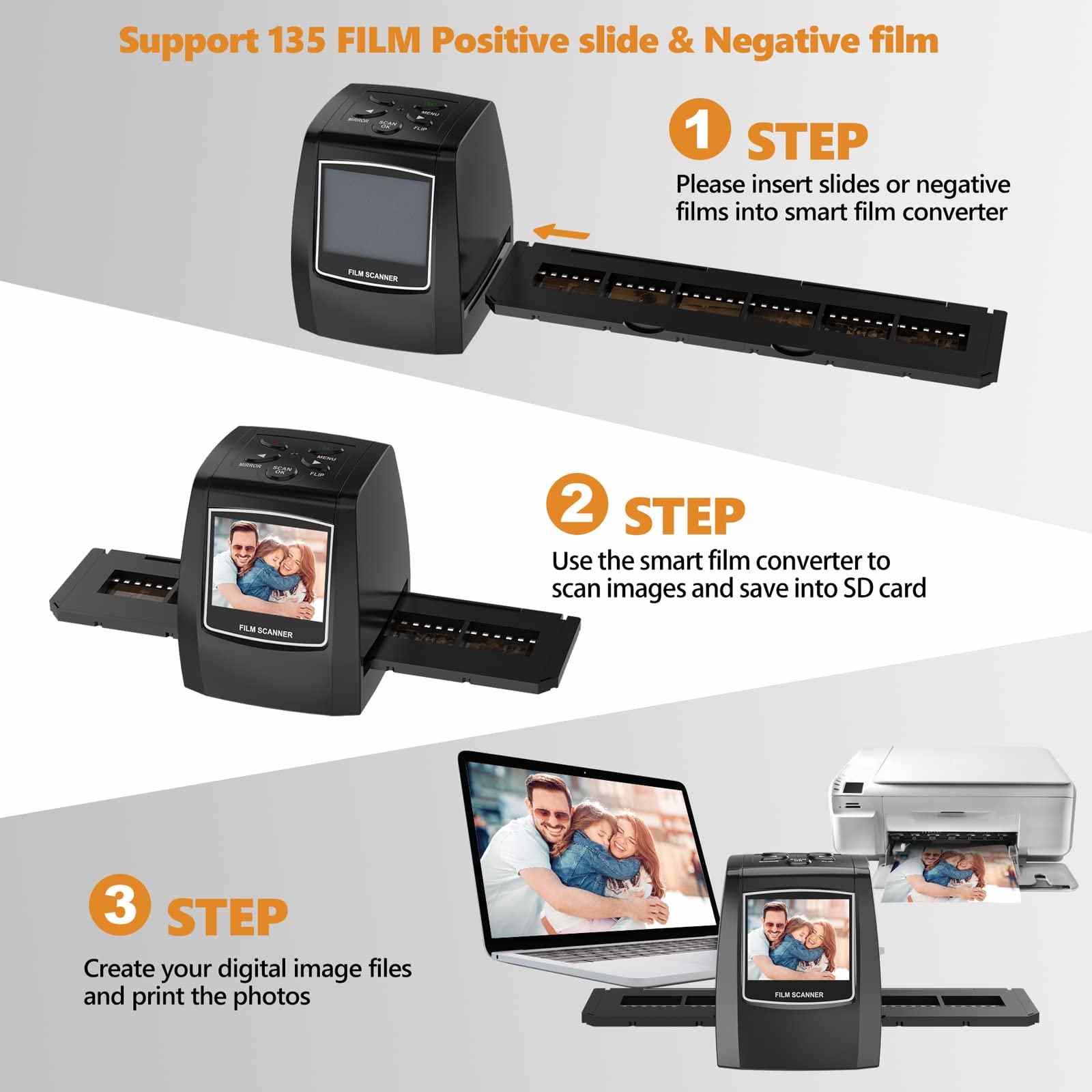 Support to 35mm/135 mm Negative & Slide, transform to JPEG format, saved directly to 32 GB SD card (Not included).